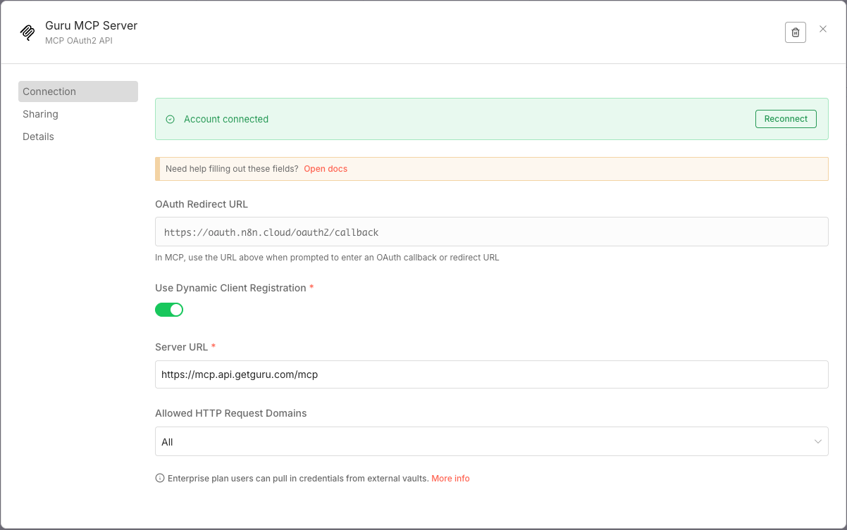 https://mcp.api.getguru.com/mcpas the MCP Endpoint URL. - Select MCP OAuth2 from the "Authentication" dropdown